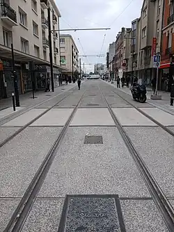 Dans les zones moins sensibles aux vibrations, on insère plus simplement sur le lit de béton des plaques, préfabriquées en usine, entre les deux files de rails d'une des voies, afin d'achever la plate-forme et son aspect pavé traditionnel. Cette pose est très différente de celle initiale de la ligne, où des pavés de granit avaient été posés de manière traditionnelle lors de l'achèvement de la plate-forme, mais n'avaient pas résisté à l'orniérage de la voie[14].