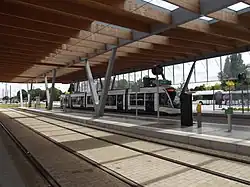 - La station François Mitterrand, qui constitue le terminus le plus à l'ouest de la ligne, est composée de deux quais encadrant deux voies. Dans le prolongement de la station, se situe un tiroir de retournement à voie unique le long du parc relais « François Mitterrand » permettant le retournement des rames. Deux trams sur 3 desservent cette station[13].