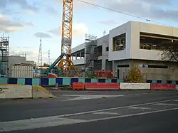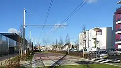 La plate-forme en travaux de la station terminus, vue depuis la passerelle de la future gare, où une correspondance directe entre tramway et le T11 est mise en place en juillet 2017. Le bâtiment à droite est le gymnase universitaire Jackson-Richardson.