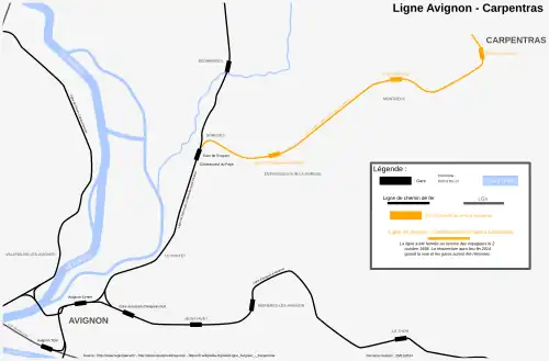 La ligne d'Avignon à Carpentras est une relation ferroviaire voyageurs entre Avignon et Carpentras dans le département de Vaucluse, dont la remise en service est effective[1]. Les travaux d'infrastructure se sont déroulés de juin 2013 à mars 2015, pour une réouverture de la ligne le .