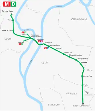 La ligne D du métro de Lyon est une ligne du réseau métropolitain de Lyon. Cette quatrième ligne, sur pneumatiques, dont le premier tronçon a été ouvert en 1991[2], relie aujourd'hui la station Gare de Vaise, dans le nord-ouest de Lyon, à la station Gare de Vénissieux.