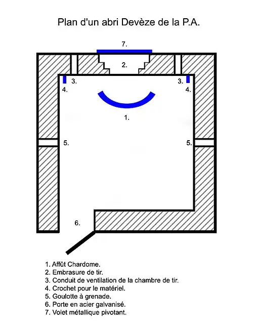 L'abri est composé d'une seule pièce, la chambre de tir, qui pouvait être occupée par trois ou quatre hommes. Une embrasure unique, protégée par un volet métallique, est prévue sur la face frontale pour permettre l'emploi d'une mitrailleuse ou d'un fusil-mitrailleur[17]. Des encoches sont présentes dans la dalle inférieure afin de pouvoir y placer un affût Chardome, du nom de l'officier des chasseurs ardennais qui développa cet affût, adapté pour la mitrailleuse Maxim 08/15 pourvue de son affût-traîneau ou d'un FM Mle 30.
