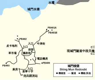 Le quartier général défensif est situé dans la redoute de Shing Mun (城門棱堡 ou 城門碉堡), qui a un poste d'observation (agissant comme quartier général de la redoute) qui peut appeler le soutien d'artillerie de la batterie du mont Davis (en) et du fort de l'île Stonecutters, et quatre casemates (PB400-403) équipées de mitrailleuses Vickers et de Bren LMG. Des canaux et tranchées défensives de 1,5 mètre de profondeur, nommés d'après des rues de Londres telles que Charing Cross, sont creusés pour aider les soldats britanniques du régiment du Middlesex (en).