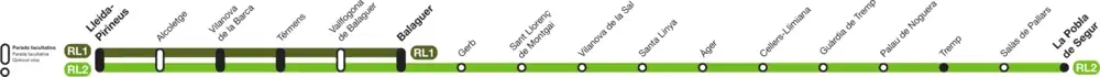 Le 13 janvier 2018, les services entre Lérida et Balaguer ont été baptisés RL1, tandis que ceux qui vont jusqu'à La Pobla de Segur sont nommés RL2. Le même jour, 5 gares sont devenues des arrêts facultatifs[22].