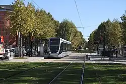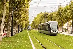 Le tramway, alimenté par une ligne aérienne de contact, circule sur une voie ferrée.