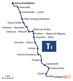 La ligne T1 s'étend sur 14,8 km et compte vingt-cinq stations, depuis Palais-de-Justice en passant par Arènes, jusqu'au MEETT, au nord-ouest de l'agglomération. Elle est connectée aux lignes Métro de ToulouseLigne B du métro de Toulouse Tramway de Toulouse Ligne T2 du tramway de Toulouse Linéo de ToulouseL4 Liste des lignes de bus de Toulouse66 à la station Palais-de-Justice, et aux lignes Métro de ToulouseLigne A du métro de Toulouse Train urbain (TER cadencé) de l'agglomération toulousaine Ligne C du réseau de transports en commun de Toulouse Tramway de Toulouse Ligne T2 du tramway de Toulouse Linéo de ToulouseL2L3 Liste des lignes de bus de Toulouse143467 à la station Arènes.