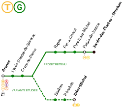 Dès 2009, alors que la ligne T1 est en construction, un prolongement de celle-ci est envisagée : c'est le projet de ligne Garonne, également connue sous le nom de ligne G. Après plusieurs débats et réunions publiques, le prolongement initialement prévu fin 2013, puis au deuxième trimestre 2014[18] doit être mis en essai en et en service en . Elle prolongera la ligne T1 en reliant la station des Arènes à la station Palais-de-Justice en passant la Garonne sur le pont Saint-Michel. Ce sera ainsi le premier maillon d'un tramway traversant Toulouse. Effectivement, le tracé choisit permet une extension ultérieure vers le sud-est toulousain (Labège ou Saint-Orens-de-Gameville, via Rangueil et Montaudran)[19]. C'est le grand projet des transports en commun de Toulouse.
