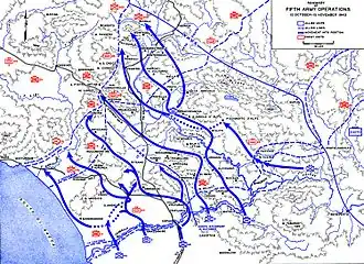 Sur l'autre côte, la 5e armée américaine, commandée par le lieutenant-général Mark W. Clark, attaque à travers le Volturno dans la nuit du 12 octobre[5]. Les Allemands utilisant des tactiques d'arrière-garde habilement en utilisant le terrain favorable à la défense, se retirèrent vers la prochaine ligne au nord (la ligne Barbara) que les Alliés atteignirent le 2 novembre.