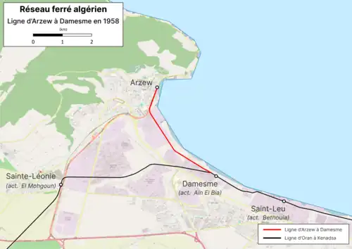 Localisation de la ligne d'Arzew à Damesme dans la région d'Oran. | |