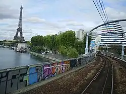 Au sud, le viaduc sur la Seine, dit pont Rouelle, est entièrement reconstruit en 1982 en respectant le style d'origine mais avec un tirant d'air plus important pour la navigation fluviale ; les poteaux caténaires font l'objet d'une recherche esthétique pour une meilleure intégration paysagère. Un saut-de-mouton est édifié sur la rive gauche à la bifurcation du Champ-de-Mars afin d'éviter les cisaillements de voies. Pour limiter le bruit pour les riverains, pourtant inférieur à celui permanent provoqué par l'importante circulation routière sur les quais, ce saut-de-mouton est recouvert d'un coffrage en béton. Enfin, la ligne est dotée du BAL avec IPCS[19].