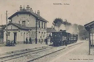 Les difficultés financières retardèrent la construction de la ligne qui fut mise en service en deux étapes: de Charleval à Vascœuil le , de Vascœuil à Serqueux le , la Compagnie des chemins de fer de l'État ayant remplacé la défunte Compagnie de l'Ouest depuis le [8]. Sans doute parce que cette voie ferrée fut la dernière mise en service par la Compagnie de l'Ouest, elle a bénéficié d'une architecture de qualité avec, par exemple, des bâtiments-voyageurs en pierre meulière souligné de parements en briques et aux toitures à pignons coupés[11].