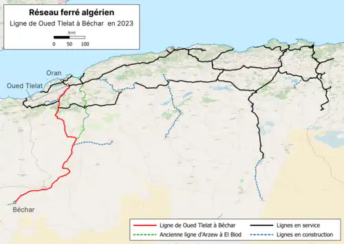 La ligne de Oued Tlelat à Béchar permet de relier Oran à Béchar depuis 2010, où cette nouvelle ligne a été mise en service à partir de sections de deux anciennes lignes datant de la fin du XIXe siècle : Oued Tlelat – Redjem Demouche et El Biod – Béchar et par la création d'une nouvelle section entre Redjem Demouche et El Biod.