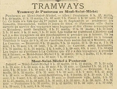 Pour faciliter aux pèlerins et touristes l'accès à l'abbaye du Mont-Saint-Michel, le conseil général de la Manche décide de faire construire une voie ferrée d'intérêt local entre la commune du Mont-Saint-Michel et la gare de Pontorson. L'acte de rétrocession est signé entre le préfet et MM. Baër et Beldant. Les deux entrepreneurs fondent la Compagnie des tramways normands chargée de construire et d'exploiter la ligne de Pontorson au Mont-Saint-Michel, ainsi que la ligne Avranches - Saint-James[4]. Le concessionnaire s'engage à faire rouler sur la ligne du Mont cinq trains quotidiens pendant la saison (du 1er juin au 1er octobre) et trois trains le reste de l'année[10]. Déclarée d'utilité publique en 1899, la ligne est bénie le par le supérieur des pères de Saint-Edme[11].