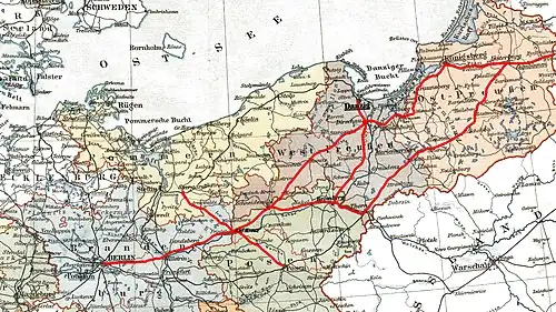 En , la longueur totale de la ligne et de ses ramifications atteint 2 210 km, en incluant la ligne parallèle principale de Bromberg et Thorn (Toruń) vers Insterbourg.