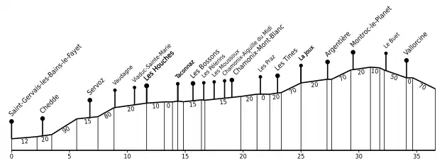 Après les Houches le profil est facile ; la voie longe l'Arve. Elle repasse rive gauche au pont de Clair-Temps (une arche maçonnée), puis atteint la halte de Taconnaz et enfin les Bossons au terme d'une ligne droite. La gare comporte un évitement. Après les Bossons, la ligne repasse rive droite au pont métallique de Piralottaz, puis arrive à la halte des Pèlerins. Cette dernière donnait accès au téléphérique des Glaciers, abandonné depuis 1951. Elle dessert deux lacs creusés pour l'extraction de matériaux lors de sa construction, le lac des Gaillands et le lac à l'Anglais, ainsi que le rocher d'escalade des Gaillands. Après la halte des Moussoux (arrêt facultatif), la ligne entre dans Chamonix et dessert l'arrêt Chamonix - Aiguille du Midi (téléphérique de l'Aiguille du Midi), avant de traverser à nouveau l'Arve et d'entrer en gare de Chamonix-Mont-Blanc[52]. Chamonix est un établissement assez important, avec trois voies à quai, des voies de service et une halle-atelier. Une passerelle permet aux voyageurs de rejoindre directement la gare du chemin de fer du Montenvers, une ligne qui permet d'accéder au Montenvers et à la Mer de Glace. Autrefois, un raccordement existait entre les deux lignes[53].