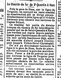 - ↑ « N° 48769 - Décret qui déclare d'utilité publique l'établissement, dans les départements de l'Aisne et de la Somme, d'un chemin de fer d'intérêt local, à voie normale, de Saint-Quentin à Ham : 24 décembre 1906 », Bulletin des lois de la République Française, Paris, Imprimerie Nationale, xII, vol. 74, no 2814, , p. 1597 - 1627 (lire en ligne).