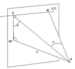 Sur la figure ci-dessus, lorsque l'angle η varie le point M décrit la ligne de fuite.