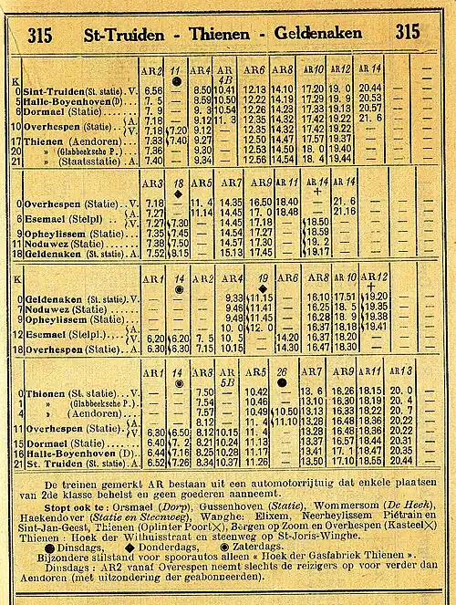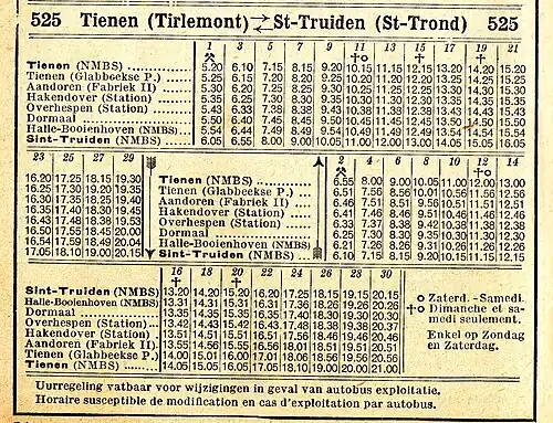 - ↑ Indicateur officiel : n°1 de 1950, Société nationale des chemins de fer belges (SNCB), du au (lire en ligne sur zone01.be)