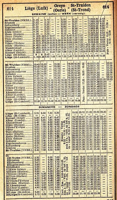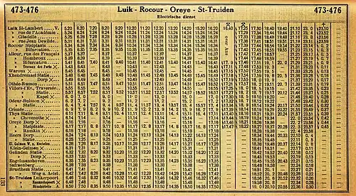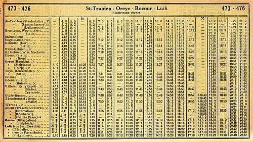 Tableaux[note 1] : 476 (1931)[3] ; 473-376 (1937)[2] après la fusion de la ligne 473 Saint-Trond - Oreye ; 614 (1955)[4].