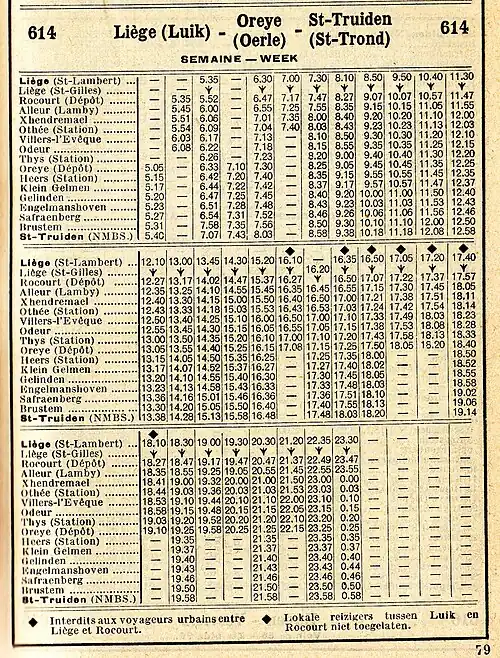 - ↑ Société nationale des chemins de fer belges (SNCB), Indicateur horaire été 1955