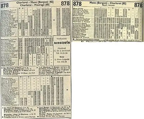 - ↑ Indicateur officiel : été 1958, Société nationale des chemins de fer belges (SNCB), du au (lire en ligne sur le Grenier Ferroviaire)