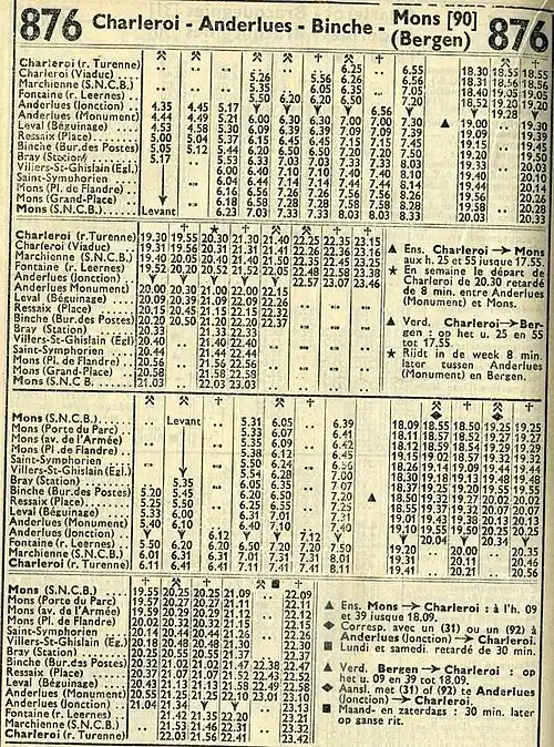 - ↑ Correspondant en Belgique à un numéro national attribué à chaque ligne de transport en commun utilisé sur les indicateurs de la Société nationale des chemins de fer belges (SNCB). Pour les lignes autres que celles de la SNCB, ce numéro ne correspond généralement pas à l'indice de la ligne.