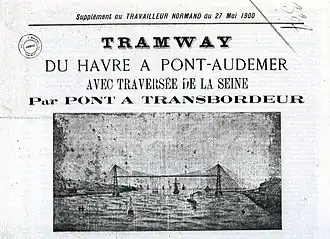 - En 1897, Arnodin, un des grands ingénieurs de son temps, proposa la construction d'une voie ferrée d'intérêt local entre Le Havre et Pont-Audemer avec traversée du grand fleuve normand au moyen d'un pont transbordeur. Cet ouvrage de 560 mètres, composé d'un tablier supérieur établi à grande hauteur (60 mètres) et placé entre deux pylônes laissant entre eux une passe maritime de 400 mètres, aurait offert un bel exemple de l'architecture métallique à proximité de l'estuaire. Sur le tablier aurait roulé un chariot auquel aurait été attachée, par l'intermédiaire de câbles en acier, une nacelle capable d'emporter un petit convoi ferroviaire[5].