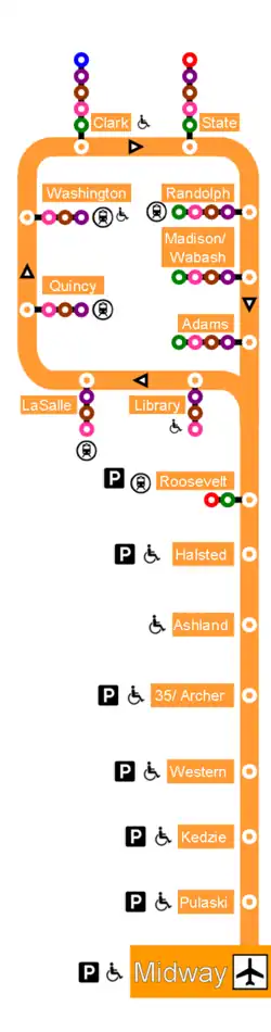 La ligne orange entre dans le Loop via l’entrée sud-ouest et la tour 18. Elle emprunte la voie intérieure et dessert les neuf stations du Loop dans le sens horlogique en commençant par la station Harold Washington Library-State/Van Buren et en terminant par la station Adams/Wabash avant de retourner vers Midway[5].