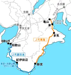 Longue de 384,2 km, la ligne est exploitée par la Central Japan Railway Company de Kameyama à Shingū (tronçon orange sur la carte), puis par la West Japan Railway Company de Shingū à Wakayama (tronçon bleu).
