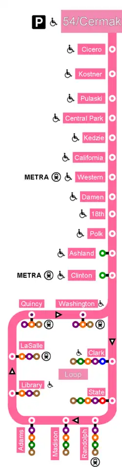 La ligne rose continue vers le centre et emprunte la voie intérieure du loop pour y faire demi-tour en commençant par la station Clark/Lake et en terminant par la station Washington/Wells afin de faire demi-tour dans le sens des aiguilles d'une montre en direction de 54th/Cermak[8].