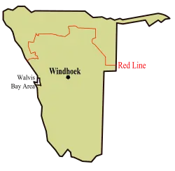 La Ligne rouge, également appelée Clôture vétérinaire ou plus communément Vet fence (abréviation de "Veterinary cordon fence") en Anglais, est une clôture d'exclusion des nuisibles qui sépare le nord de la Namibie des régions du centre et du sud. Elle englobe plusieurs régions du nord : les régions d'Oshana, de Kavango Est, d'Omusati, du Zambèze, d'Omaheke, de Kunene, ainsi que certaines parties de la région d'Oshikoto[1]. Au sud de la clôture se trouvent aujourd'hui des fermes commerciales où les agriculteurs, dont beaucoup sont blancs, sont propriétaires des terres. Au nord de la ligne, en revanche, toutes les terres agricoles sont communautaires et exploitées principalement par des agriculteurs ovambos ou kavangos. La ligne rouge est une ligne hautement surveillée, dotée de barrages routiers (en particulier à la hauteur d'Oshivelo sur la B1[2]) pour contrôler chaque véhicule qui passe. Cette barrière de protection sanitaire permet notamment aux éleveurs situés au sud de cette ligne de bénéficier du statut d'exportateur de viande vers le lucratif marché de l'Union européenne, mais en exclut les éleveurs les plus pauvres situés au nord[3].