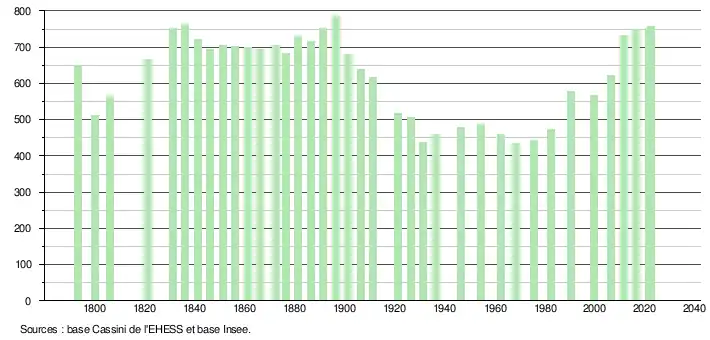 En 2022, la commune comptait 758 habitants[Note 3], en évolution de +1,34 % par rapport à 2016 (Allier : −1,38 %, France hors Mayotte : +2,11 %).
