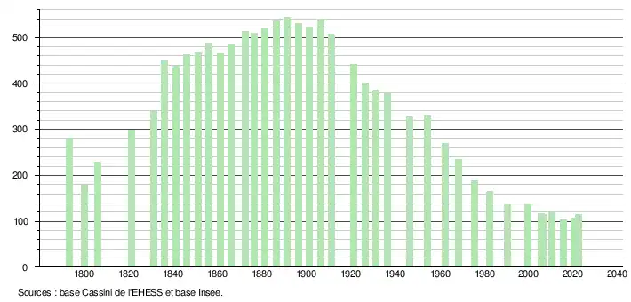 L'évolution du nombre d'habitants est connue à travers les recensements de la population effectués dans la commune depuis 1793. Pour les communes de moins de 10 000 habitants, une enquête de recensement portant sur toute la population est réalisée tous les cinq ans, les populations de référence des années intermédiaires étant quant à elles estimées par interpolation ou extrapolation[28]. Pour la commune, le premier recensement exhaustif entrant dans le cadre du nouveau dispositif a été réalisé en 2005[29].