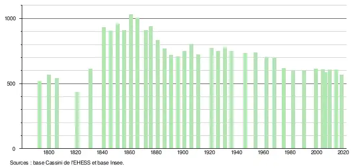 L'évolution du nombre d'habitants est connue à travers les recensements de la population effectués dans la commune depuis 1793. Pour les communes de moins de 10 000 habitants, une enquête de recensement portant sur toute la population est réalisée tous les cinq ans, les populations de référence des années intermédiaires étant quant à elles estimées par interpolation ou extrapolation[25]. Pour la commune, le premier recensement exhaustif entrant dans le cadre du nouveau dispositif a été réalisé en 2004[26].