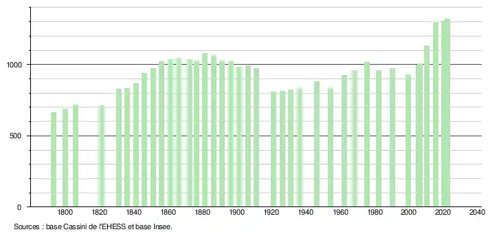 L'évolution du nombre d'habitants est connue à travers les recensements de la population effectués dans la commune depuis 1793. Pour les communes de moins de 10 000 habitants, une enquête de recensement portant sur toute la population est réalisée tous les cinq ans, les populations de référence des années intermédiaires étant quant à elles estimées par interpolation ou extrapolation[36]. Pour la commune, le premier recensement exhaustif entrant dans le cadre du nouveau dispositif a été réalisé en 2005[37].
