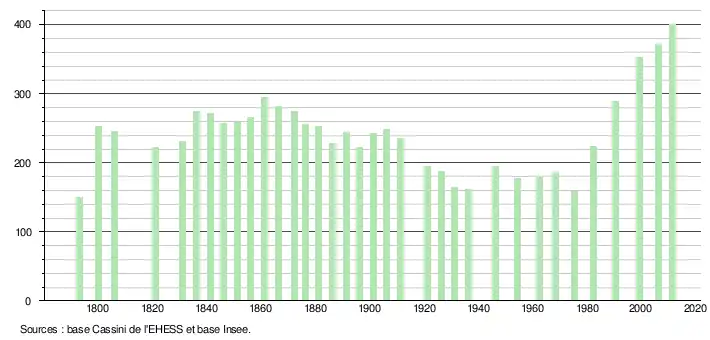 - ↑ Dans le tableau des recensements et le graphique, par convention dans Wikipédia, le principe a été retenu, pour les populations légales postérieures à 1999 de n’afficher dans le tableau des recensements et le graphique que les populations correspondant à l'année 2006, première population légale publiée calculée conformément aux concepts définis dans le décret no 2003-485 du 5 juin 2003, et les années correspondant à une enquête exhaustive de recensement pour les communes de moins de 10 000 habitants, ainsi que la dernière population légale publiée par l’Insee.