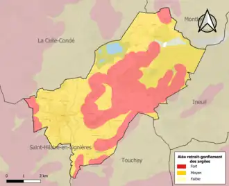 La commune est vulnérable au risque de mouvements de terrains constitué principalement du retrait-gonflement des sols argileux[14]. Cet aléa est susceptible d'engendrer des dommages importants aux bâtiments en cas d’alternance de périodes de sécheresse et de pluie. 97,6 % de la superficie communale est en aléa moyen ou fort (90 % au niveau départemental et 48,5 % au niveau national). Sur les 924 bâtiments dénombrés sur la commune en 2019, 924 sont en aléa moyen ou fort, soit 100 %, à comparer aux 83 % au niveau départemental et 54 % au niveau national. Une cartographie de l'exposition du territoire national au retrait gonflement des sols argileux est disponible sur le site du BRGM[15],[Carte 2].