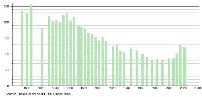 L'évolution du nombre d'habitants est connue à travers les recensements de la population effectués dans la commune depuis 1793. Pour les communes de moins de 10 000 habitants, une enquête de recensement portant sur toute la population est réalisée tous les cinq ans, les populations de référence des années intermédiaires étant quant à elles estimées par interpolation ou extrapolation[28]. Pour la commune, le premier recensement exhaustif entrant dans le cadre du nouveau dispositif a été réalisé en 2005[29].