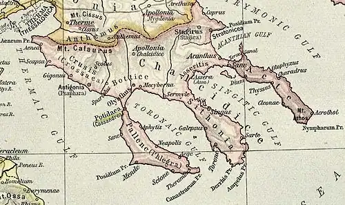 Depuis le VIIIe siècle av. J.-C., la Chalcidique est peuplée de colons originaires d'Eubée (la cité de Chalcis a donné son nom à la péninsule). Selon certains historiens, les Chalcidiens ne seraient pas venus d'Eubée, mais appartiendraient à une branche des Ioniens installés au Ier millénaire av. J.-C. au cours de leur migration[1]. D'autres colons s'installent en provenance de Corinthe, d'Erétrie et d'Andros.