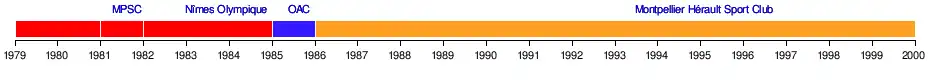 | 1988-1989 | Indépendante Pont-Saint-Esprit | Perpignan FC | Montpellier Paillade SC rés. | RC Paillade |