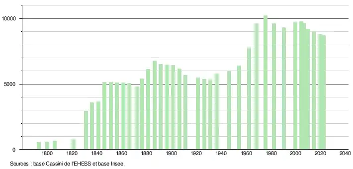 - ↑ Population municipale de référence en vigueur au 1er janvier 2025, millésimée 2022, définie dans les limites territoriales en vigueur au 1er janvier 2024, date de référence statistique : 1er janvier 2022.