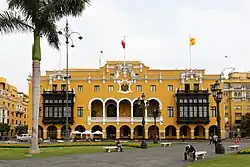 Cependant, à l'instar de la région, d'abord appelée Nouvelle-Castille puis Pérou, la ville s'appelait Ciudad de los Reyes de Lima (Ville des Rois de Lima)[38]. Avec le temps a persisté son nom original qui provient de la langue quechua (rimaq ['li.maq'], bavard) par sa rivière, le Rímac.. Pizarro, avec la collaboration de Nicolás de Ribera, Diego de Agüero et Francisco Quintero, traça personnellement la Plaza Mayor et le reste du réseau urbain[38], construisant le Palais de la Vice-róllate[39] (aujourd'hui transformé en palais du gouvernement du Pérou, qui conserve donc le nom traditionnel de Casa de Pizarro[40]) et la cathédrale[39], dont Pizarro posa la première pierre de ses propres mains[41]. En , la ville florissante est assiégée par les troupes du monarque Manco Inca Yupanqui et par Quizu, mais après six jours de siège les Espagnols et leurs alliés indigènes parviennent à les vaincre[42].