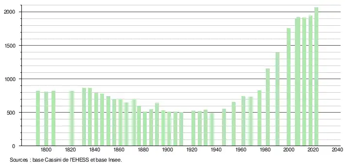 L'évolution du nombre d'habitants est connue à travers les recensements de la population effectués dans la commune depuis 1793. Pour les communes de moins de 10 000 habitants, une enquête de recensement portant sur toute la population est réalisée tous les cinq ans, les populations de référence des années intermédiaires étant quant à elles estimées par interpolation ou extrapolation[32]. Pour la commune, le premier recensement exhaustif entrant dans le cadre du nouveau dispositif a été réalisé en 2007[33].
