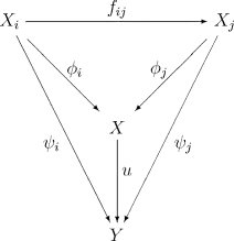 soit commutatif pour tous i ≤ j. La limite inductive est notée : . On parlera de limite inductive des Xi suivant les morphismes de transition fij, ou par abus de langage, de limite suivant I, voir tout simplement de limite inductive des Xi.