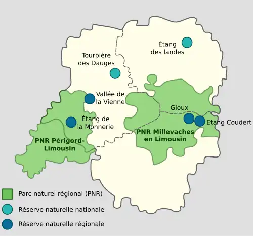 La région est occupée par plusieurs zones humides et tourbières (tourbière du Longéroux en Corrèze notamment), dont une des plus importantes, la tourbière des Dauges, est classée réserve naturelle nationale.