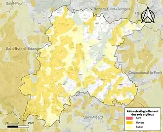 Le retrait-gonflement des sols argileux est susceptible d'engendrer des dommages importants aux bâtiments en cas d’alternance de périodes de sécheresse et de pluie[18]. 48,2 % de la superficie communale est en aléa moyen ou fort (27 % au niveau départemental et 48,5 % au niveau national métropolitain)[Carte 2]. Depuis le , en application de la loi ÉLAN, différentes contraintes s'imposent aux vendeurs, maîtres d'ouvrages ou constructeurs de biens situés dans une zone classée en aléa moyen ou fort[Note 2],[19].