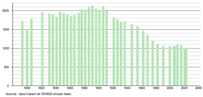L'évolution du nombre d'habitants est connue à travers les recensements de la population effectués dans la commune depuis 1793. Pour les communes de moins de 10 000 habitants, une enquête de recensement portant sur toute la population est réalisée tous les cinq ans, les populations de référence des années intermédiaires étant quant à elles estimées par interpolation ou extrapolation[43]. Pour la commune, le premier recensement exhaustif entrant dans le cadre du nouveau dispositif a été réalisé en 2005[44].