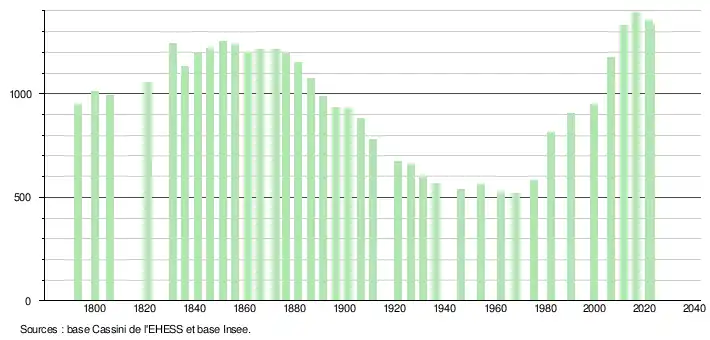 L'évolution du nombre d'habitants est connue à travers les recensements de la population effectués dans la commune depuis 1793. Pour les communes de moins de 10 000 habitants, une enquête de recensement portant sur toute la population est réalisée tous les cinq ans, les populations de référence des années intermédiaires étant quant à elles estimées par interpolation ou extrapolation[41]. Pour la commune, le premier recensement exhaustif entrant dans le cadre du nouveau dispositif a été réalisé en 2006[42].