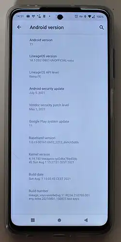 - ↑ (en) LineageOS, « Changelog 27 - Thriving Thirteen, Amazing Aperture, Careful Commonization », sur lineageos.org (consulté le ).