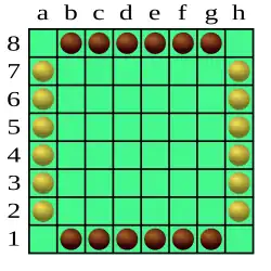 Chaque joueur contrôle 12 pions qui sont placées au départ comme sur le schéma ci-dessous :